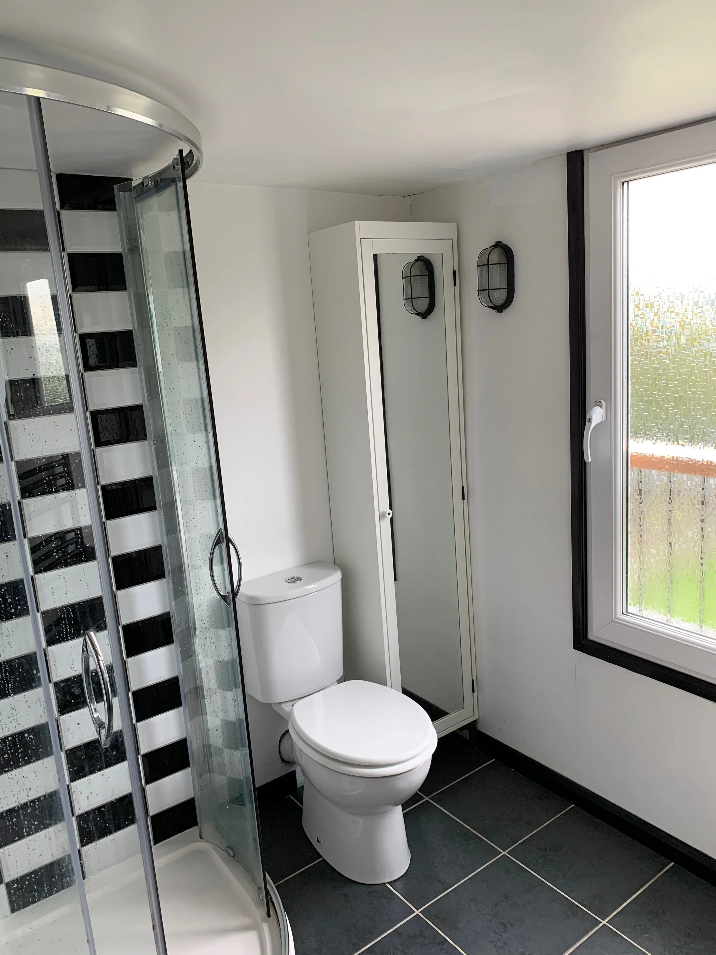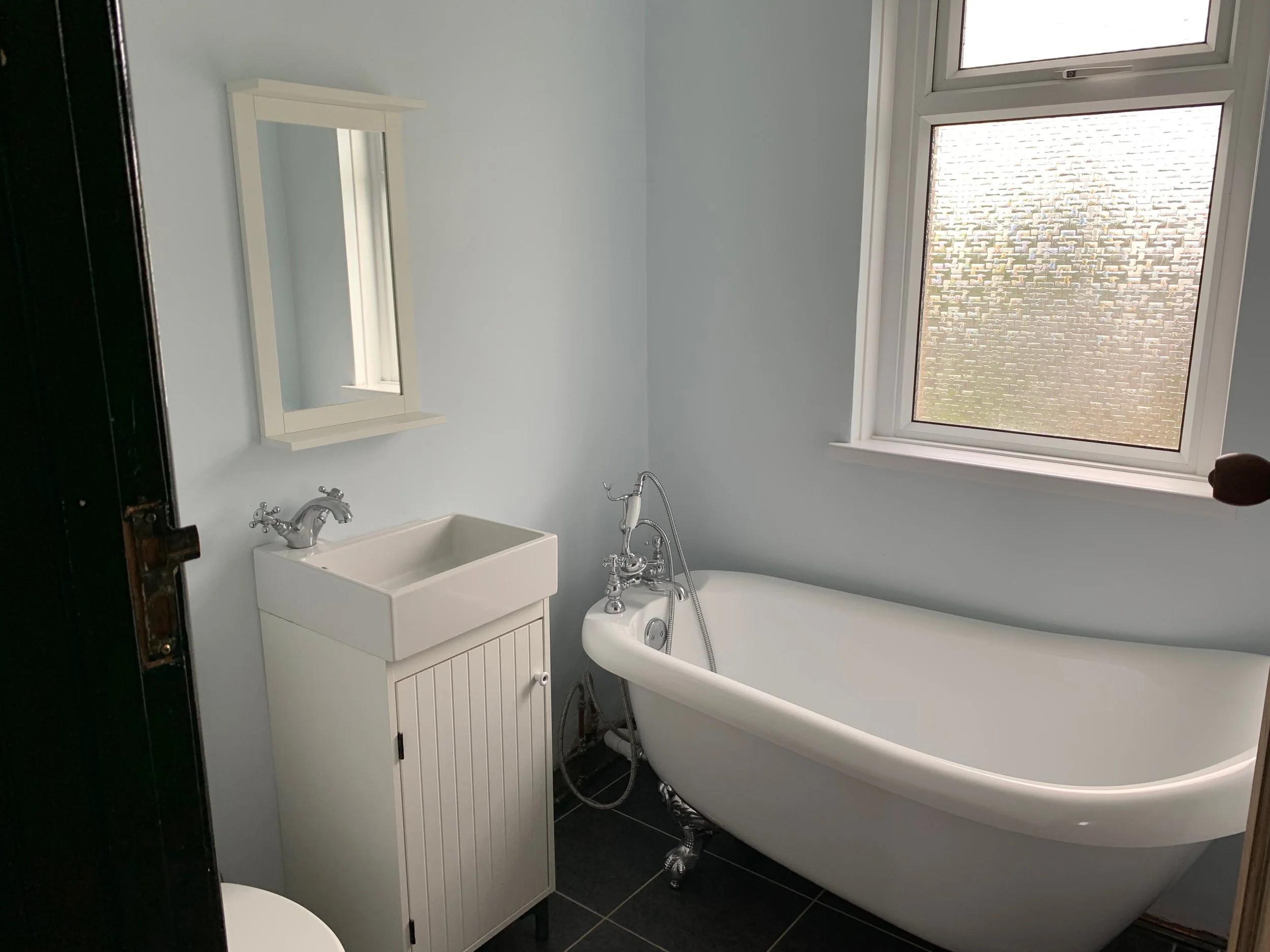 This project was quiet involved as we needed to a convert a separate toilet and bathroom into one room and move the door to create the space. It also required a full re-plumb as the existing plumbing had issues, along the lath wall being in a bad state after removal of the tiles. Once all the wall tiles, wall and the door way made good, the whole room was boarded out, and skimmed, All pipe work was run under the floor boards to a manifold system to enable easy isolation of all the sanitary units. Once the plumbing was finished all white goods were fitted and the tiling completed, a bespoke shelving unit build with secret removable back panel to enable access to the manifold system.